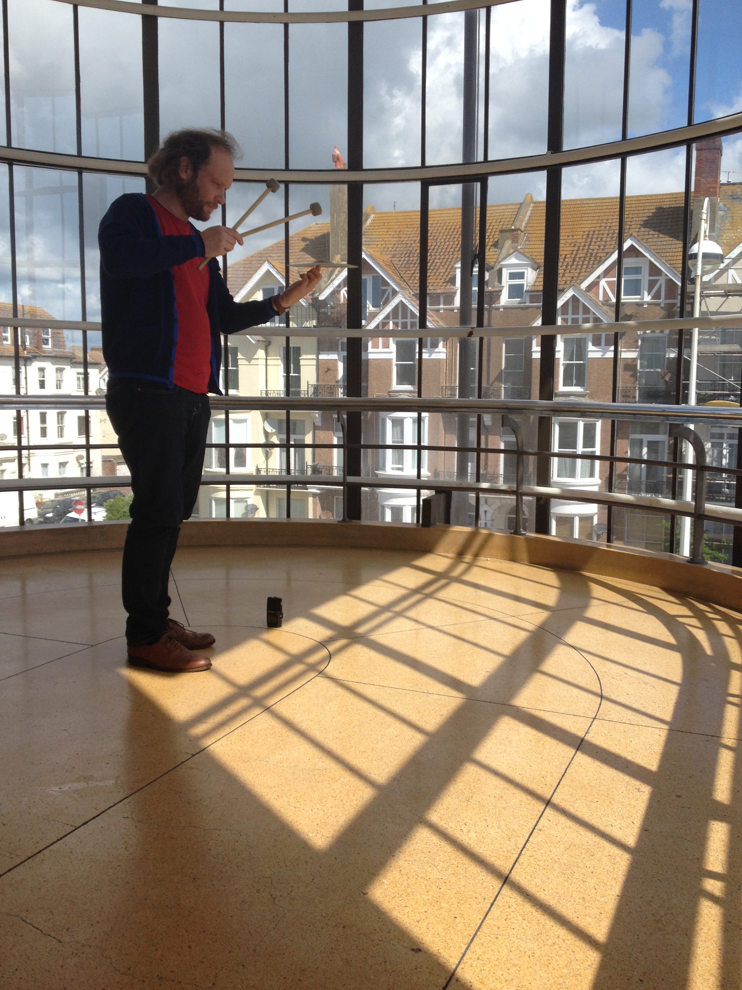 Yesterday Ollie and I spent the morning over at the De La Warr as part of our residency. We decided to spend a bit of time in the two front stairwells, Ollie brought a long a selection of Cymbals and metal bowls and some drum sticks! the stairwells are an excellent space with their own natural reverb, perfect for singing in! We created a number of improvised percussion pieces, and I was particularly interested in using the fixtures and fittings as ways of creating rhythmic patterns which proved to be extremely successful.